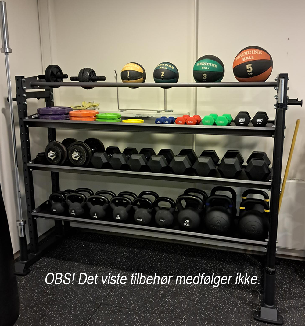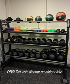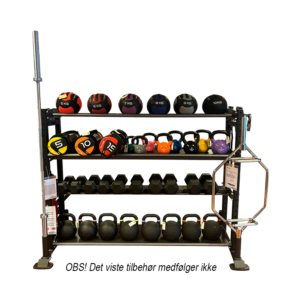 Med de forskellige hyldetyper kan stativet opbevare shoulder bags, functional bags, slam balls, fitnessbolde, kettlebells, håndvægte og meget mere. Derudover er der mulighed for at hænge elastikker på stativet, ligesom 50 mm vægtstænger kan opbevares i enderne. Bumper plates kan også opbevares på de dedikerede hylder.