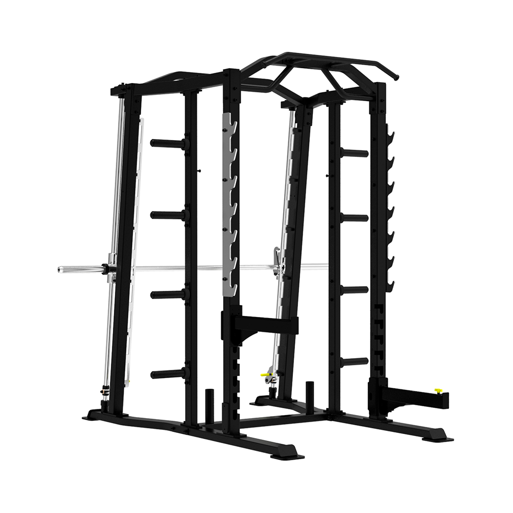 7 niveauer af vægtstangsholdere på half rack, 10 vægtstangspositioner på Smith, Total load på half rack og smith er begge på maksimal 300kg.